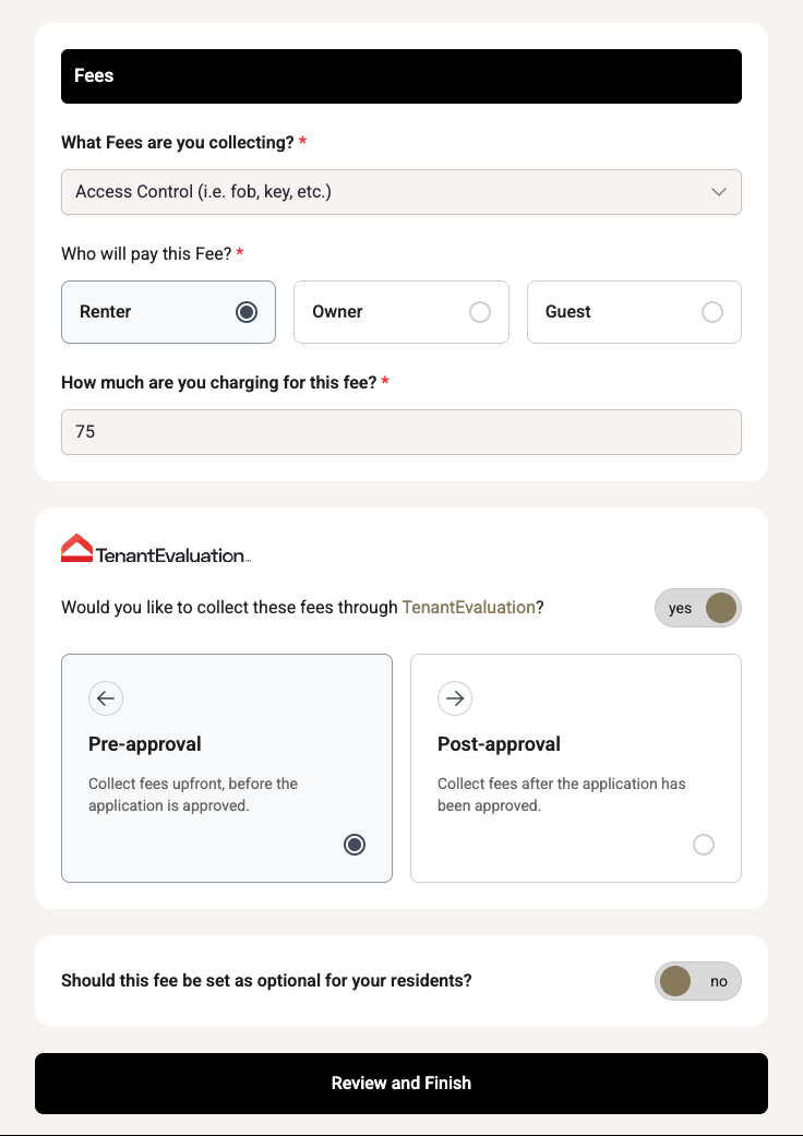 Choose when the fee will be collected (Tenant Evaluation users only)