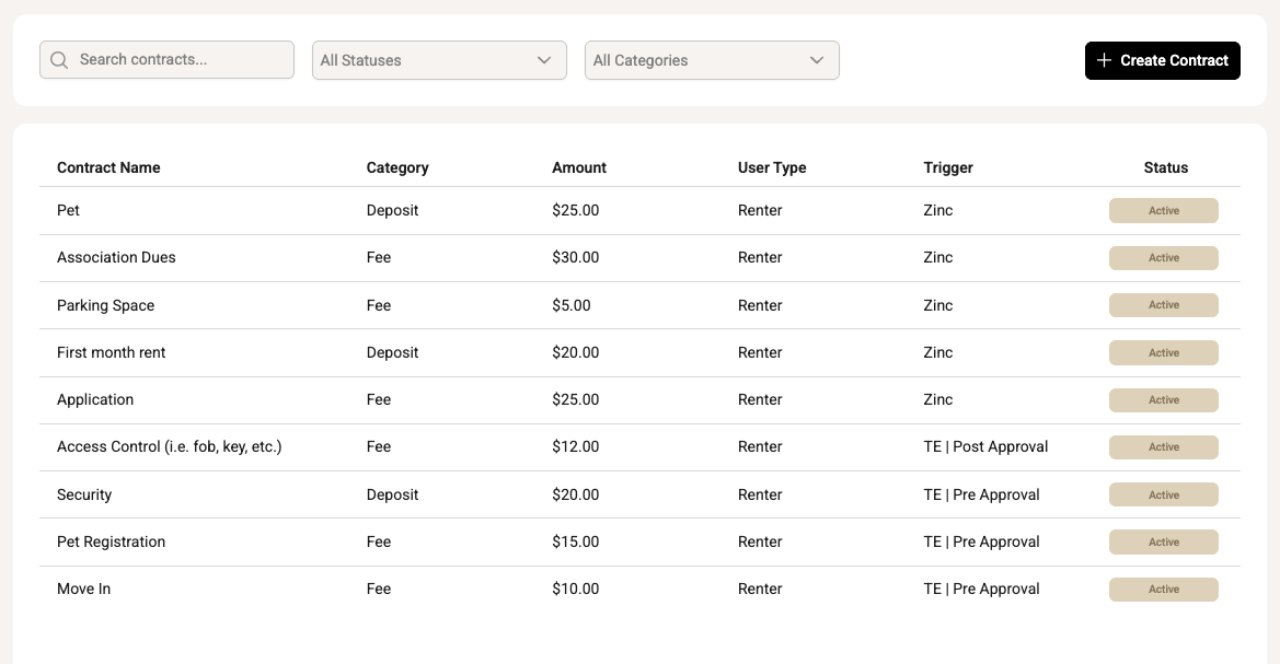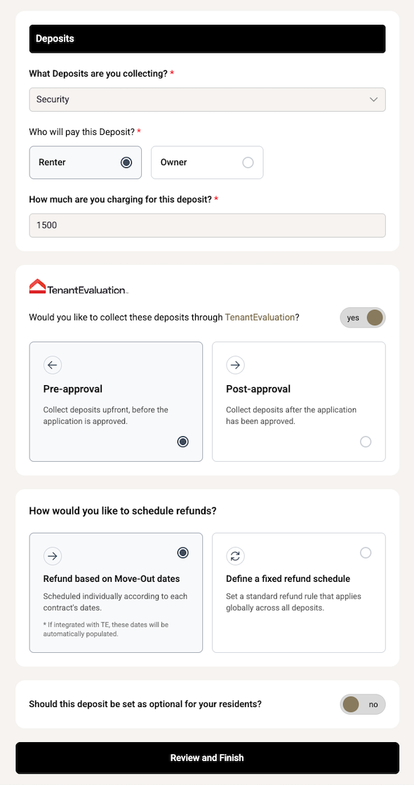 If your property uses Tenant Evaluation with QuickApprove, you can define when the contract is collected: