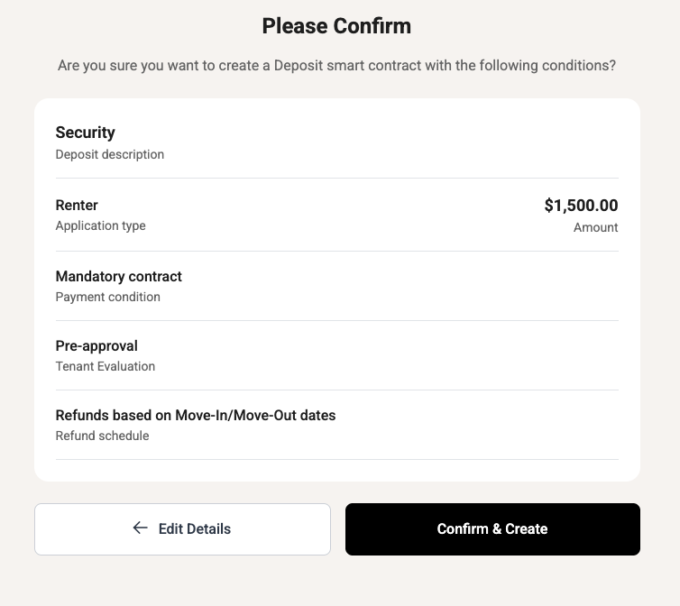 After you’ve set all the terms of your new smart contract, a summary will appear for you to review before you click Confirm & Create.