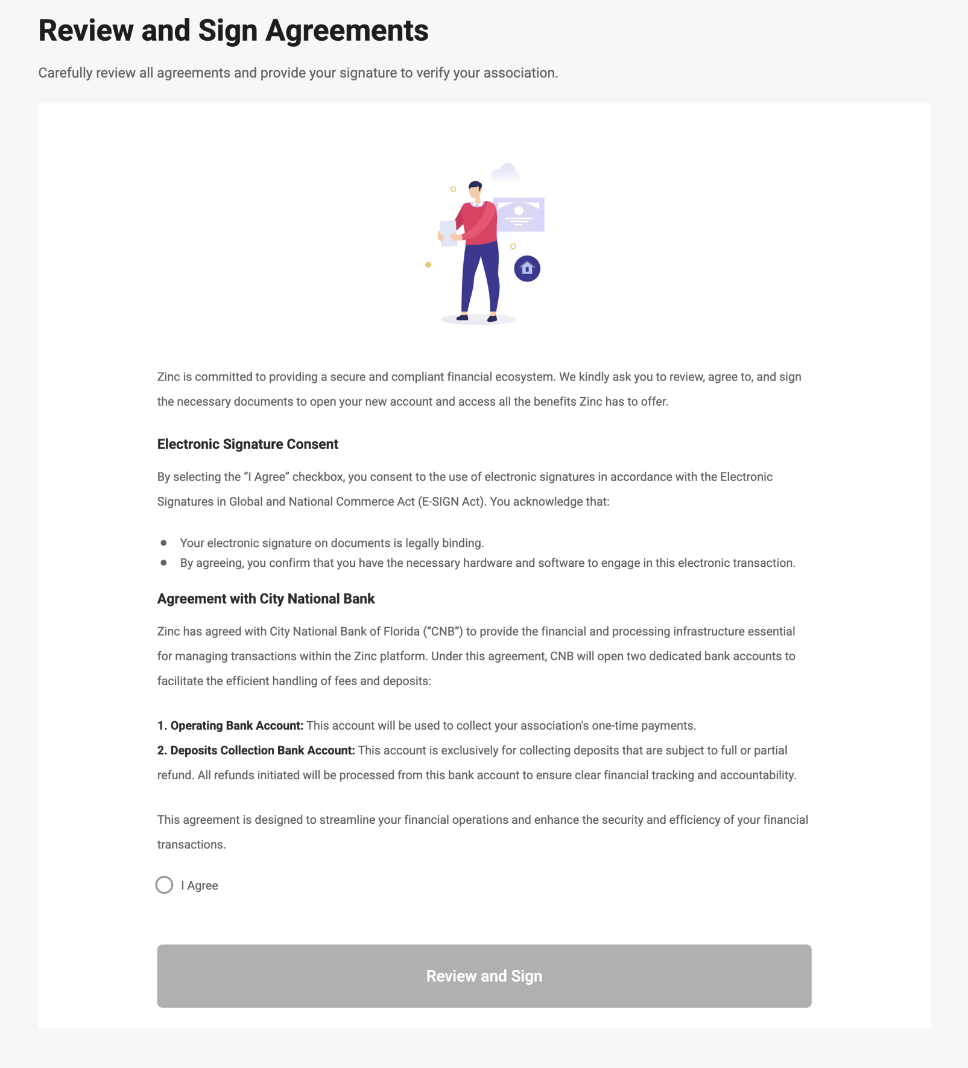 Next, you will review and electronically sign the remaining agreements authorizing the opening of your Association’s new Zinc account.
