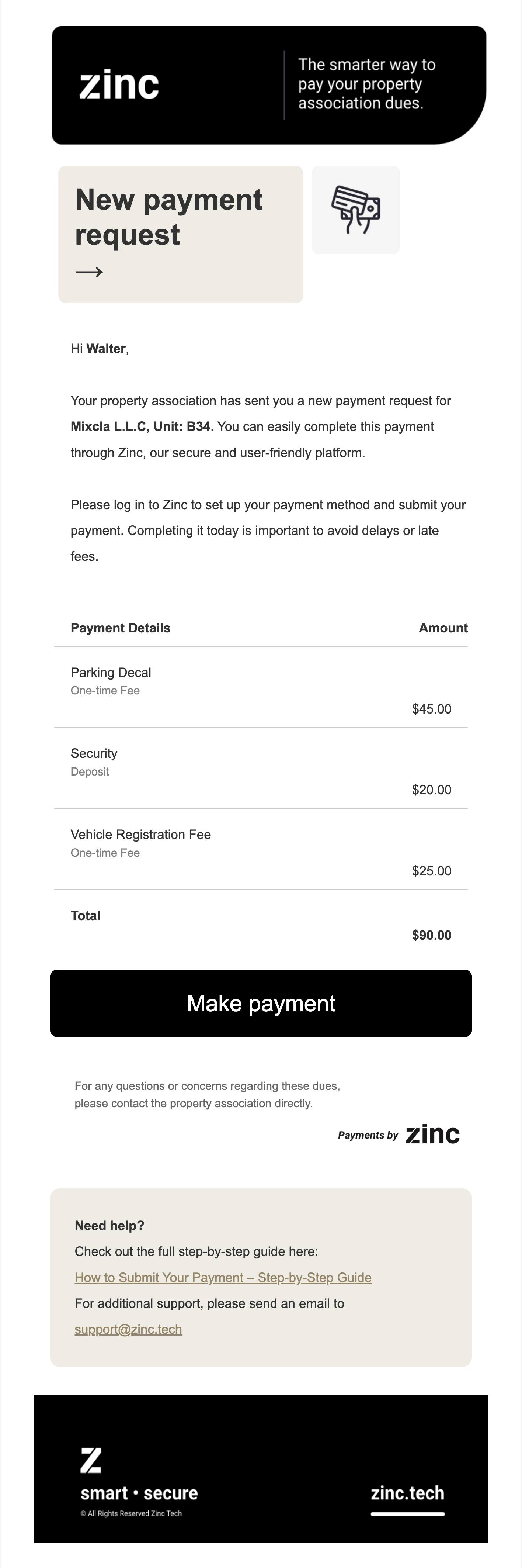 You will receive an email notification from Zinc on behalf of your Property Association.